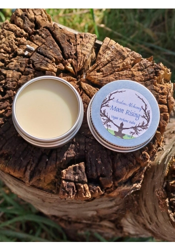 Our Moon Rising solid perfume balm is infused with patchouli, palmarosa, vetiver, cedarwood, orange and lemongrass essential oils.